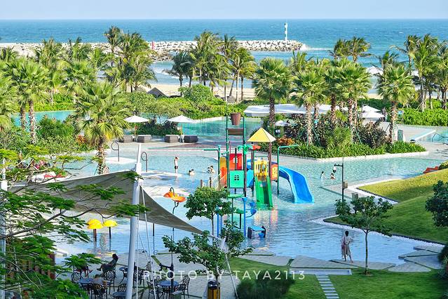 妞儿最欢乐的当然要属游泳池了,香水湾富力万豪酒店,坐拥5公里延绵细软的沙滩,可以游泳测地方自然不少,但是带着孩子的亲们,请注意安全,建议还是使用酒店游泳池吧,安全有保障。酒店拥有450平方米的泳池,分为三个区域,分别是儿童池、成人池和,可以让你面朝大海尽情畅游。第二天的下午,从游船上下来,稍作休息,在太阳略微西斜以后,我们就去了游泳池,得到允许的妞儿,在水里和一群老外小朋友在这里玩疯了,为父在岸上叹息,又黑了一圈,又黑了一圈,诶!当然这个时候,老外们已经在游泳池里玩耍了很久了,老外帅哥带着小孩子们在儿童池里玩耍,扔皮球,一起滑水,一起被游乐设施浇个通透,而金发美女们,一溜的躺在沙滩椅上做日光浴,身上的裸露出来的部分全部都晒的通红,据说这叫小麦色,健康色,有钱色。随着中国小宝宝不断的增多,儿童池里妈妈也多了起来,老外也逐步的结束今天的游泳回房间去了。这一点很有意思,老外喜欢晒一点,我们喜欢阴凉一点,老外多是爸爸带娃玩,我们多是妈妈带,当然现在,越来越多的父亲参与到孩子的日常的教育和游玩中,教育毕竟是家庭的事情,那一方缺位都会带来缺憾。