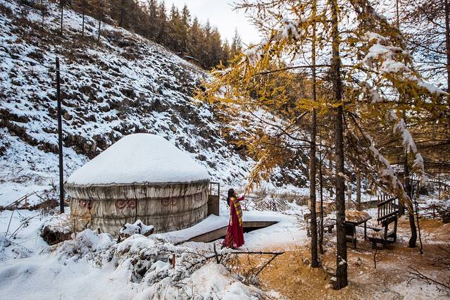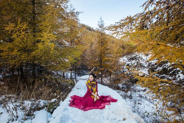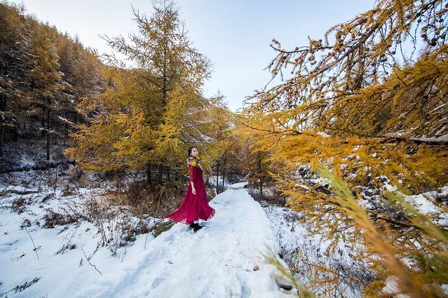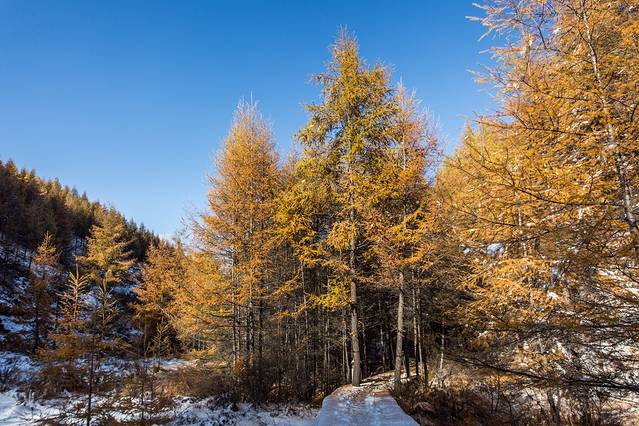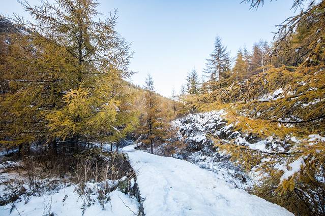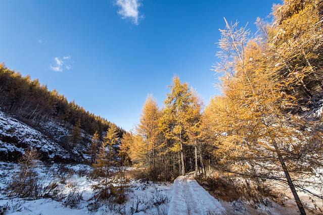 “北雪冷,南雪柔”,暖黄针叶林衬托的北方之雪也柔情