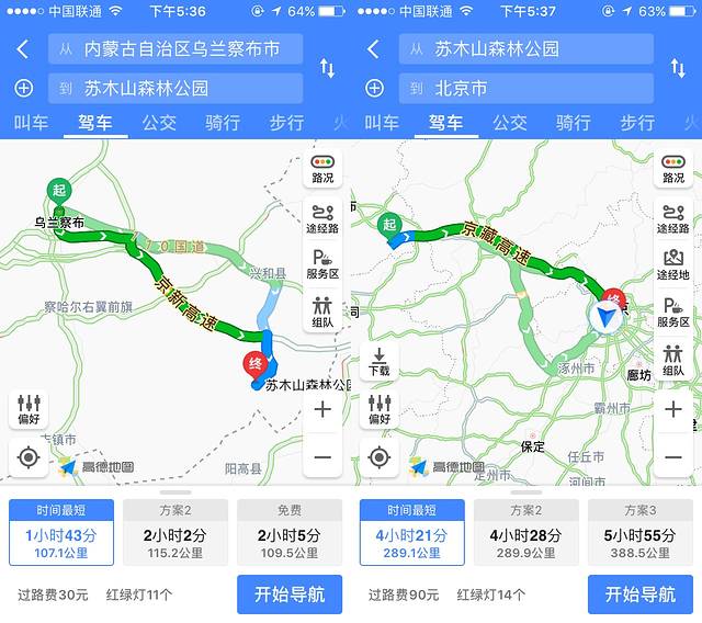 同样,距离、用时以及过路费在下面的地图中都有体现,定位【苏木山森林公园】即可~