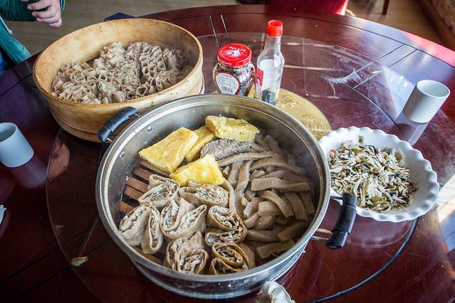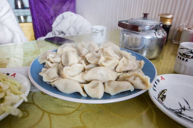 炉子上热腾腾的蒸汽和来自周围内蒙大叔们的烟雾,让人有种久违的温暖,大概是好久没有来过这种充满着市井气息的地方了。饭菜也很接地气,看着外面漫天飘舞的冰渣和小雪花,三五好友窝在这里,聊着那些诗和远方,大概就是“绿蚁新醅酒,红泥小火炉”的情怀。只不过,我们把酒换成了饺子汤。