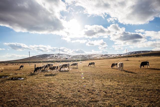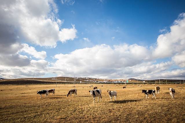不时回头眺望,云层移动的很快,在枯黄的草原上投下大面积的3D投影,觉得这与青藏铁路沿线的风景竟没有太大差异。