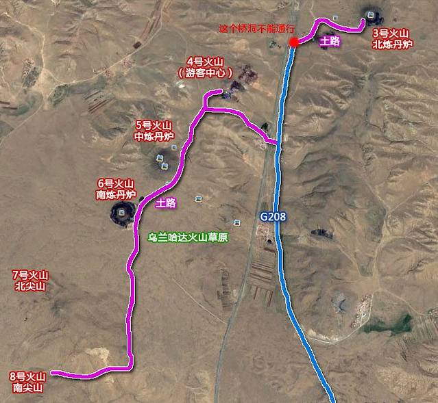 这里要注意!!上面的地图中,在3号火山处的土路和G208交汇处,也有一个桥洞,理想状态是穿过那桥洞便可以到达4号火山群;然而现在因为景区还未建成,这个桥洞还处在施工中。所以,要沿着G208继续往南走~