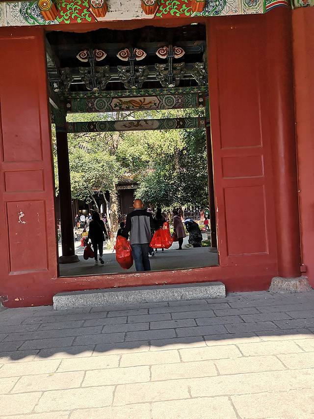 南岳大庙门票非常容易拿到,不用排队,有好几个窗口也有自动售票机。进入南岳大庙,舅 舅就交待我 们系好衣服纽扣、不能嚼吃东西。不能带帽子和墨镜。还帮拿着山上的香。从前门进入南岳大庙,两旁绿树葱葱,每穿过一道门都有讲究。