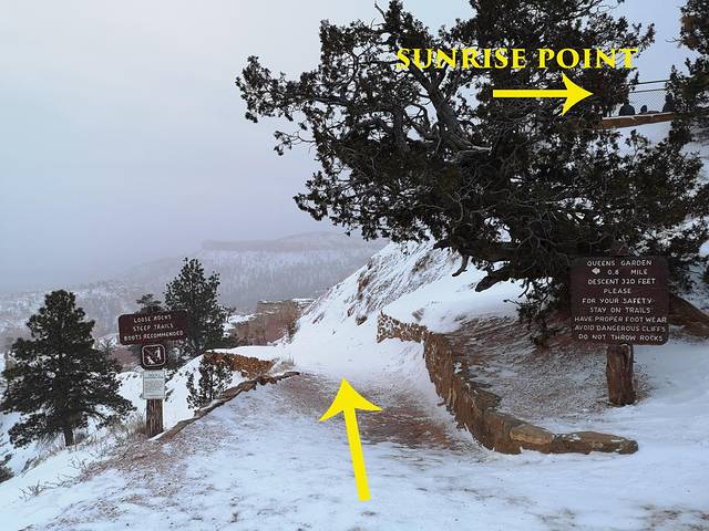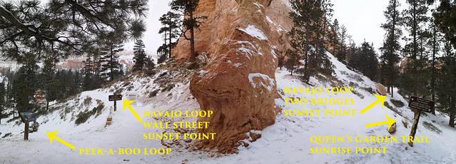 走到谷底,便会走到这个岔路口,我们从最右侧来,先往最左侧的peekaboo loop走,这是个环线,走完还会回到这里,wall street冬季封路,我们还是走到wall street的入口,再折返回来,最后走右侧第二条路,经two bridges上谷到达sunset point。