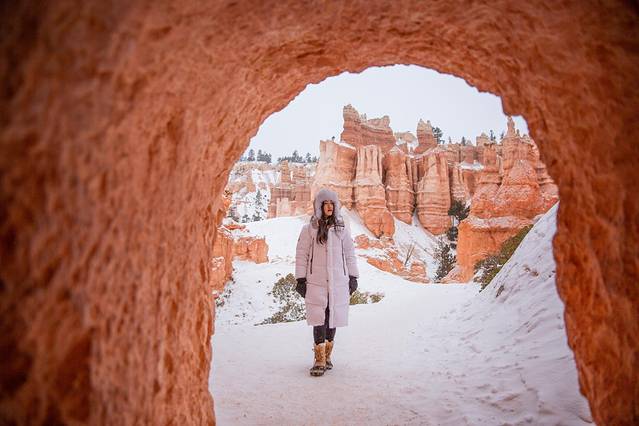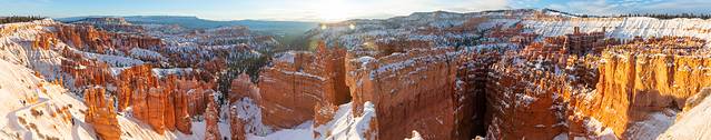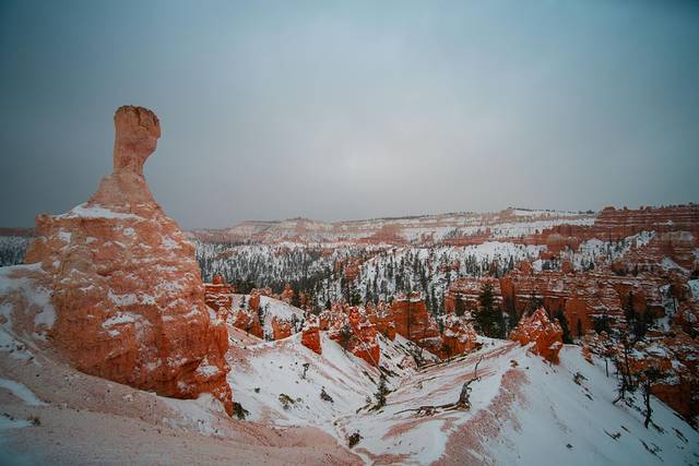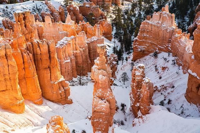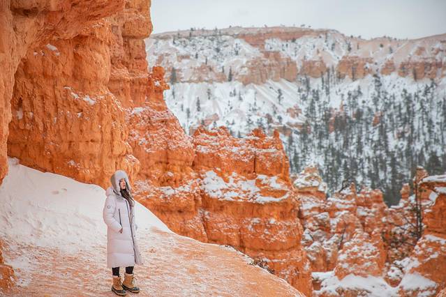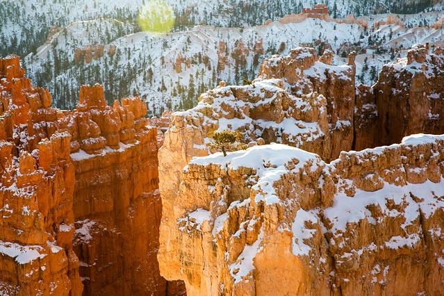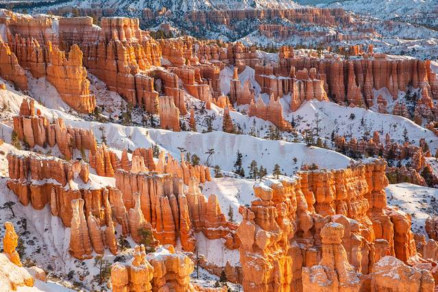 最令人惊艳的风景就数雪后的布莱斯峡谷国家公园了。公园内的核心景观是被大片大片侵蚀为状如幽灵的石塔或 石柱 。挟带着粗砂石的风,水滴的冰冻和消融将彩色的岩石凿刻出了奇异的形态,造就了布莱斯峡谷的盛景。sunset point的日出,美得明媚,美得通透。