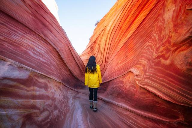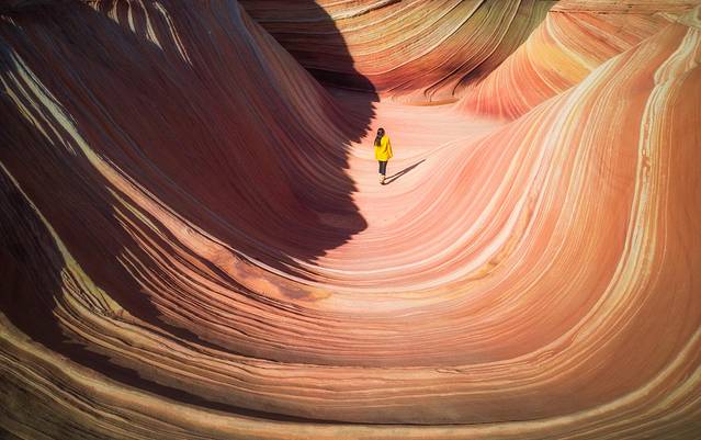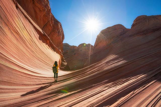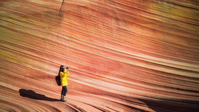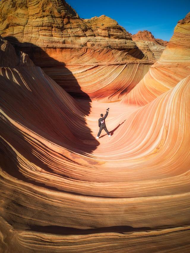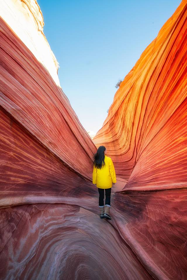 这里可能是许多摄影师和旅行者的终极梦想。为了保护地貌环境,每天只接受全世界二十人进入,网上抽签和现场摇号都公正公开,中签率之低可以想见。我们抱着去现场见识一下抽签流程的心态,竟然意外抽到第二天入谷的许可。往返八小时只靠纸质地图的徒步,只为了见到世上唯一的波浪谷。绝对是once in a lifetime的体验!冬季入谷比夏季温度适宜,对体力耐力要求更低。由于冬季太阳高度角小,我们又刚好是冬至日到访,所以谷内全天都有很大面积的阴影,但这也完全不影响她的美。