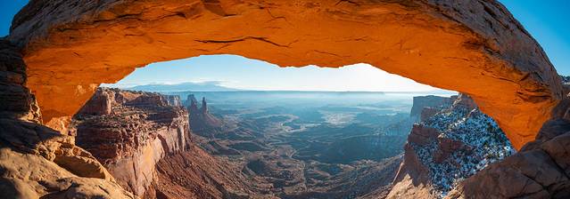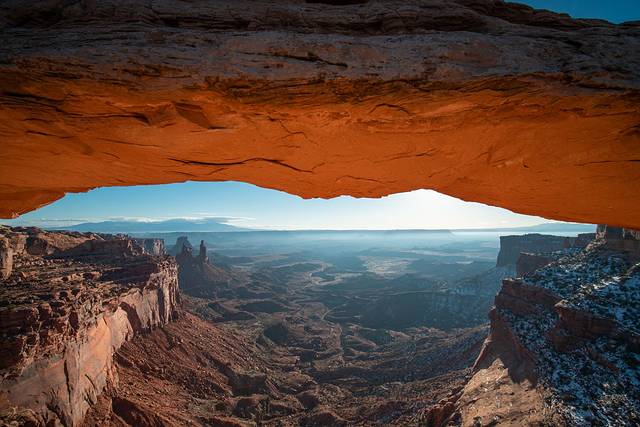 初升的太阳映在石拱上呈现出温暖的橙色,和远处湛蓝的天空,深邃的峡谷形成一幅对比强烈的画面。
