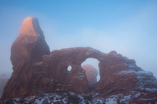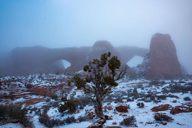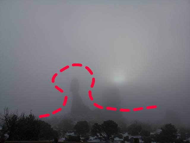 这样的天气给人感觉很像寂静岭。南北窗拱门在同一块巨岩上。