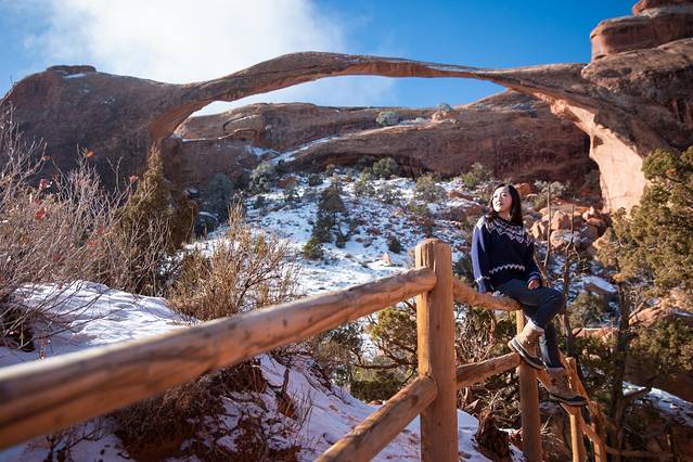 来恶魔花园必看的就是景观拱门landscape arch了,到达这里单程1.3km左右,爬升不大,难度不高。景观拱门跨度很大,最细的地方看上去好像就要断掉。