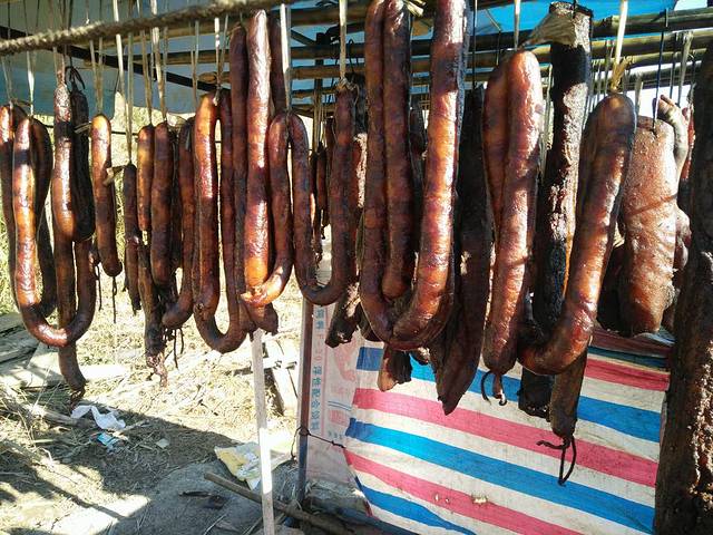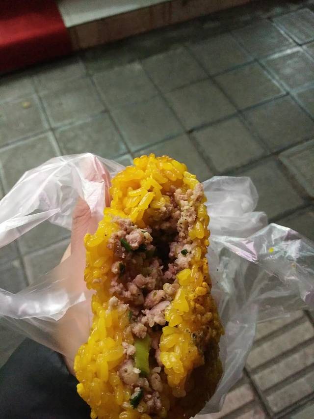 黄色的糯米饭,不同于广西的是,它有肉馅,放在火上烤,外硬里软。