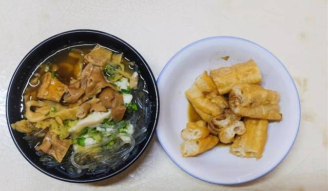 它家的豆花带有一点点熏味,打一勺豆花加上提前在骨汤里煮过并晾凉的粉丝和大肠笋干猪肺等卤水(要早点来,来晚了很多料就没有了),最后加一小勺卤汁,撒上芹菜碎,再剪根油条搭配吃。这可不是什么黑暗料理,就算不喜欢咸豆花的人也会一秒爱上。