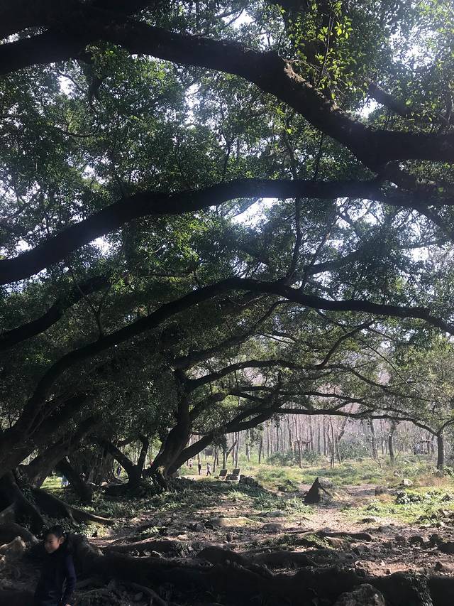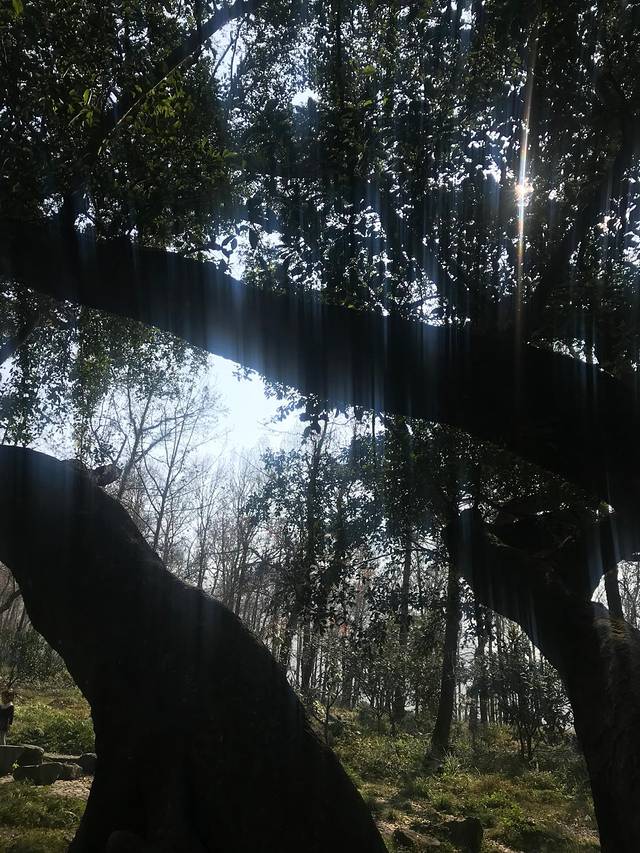 站在一颗不那么大、人没那么多的树逆光的一面,蓦然发现太阳的光线透过树枝、树叶散落下来,一条条射线上挂着星星点点,如阳光雨。