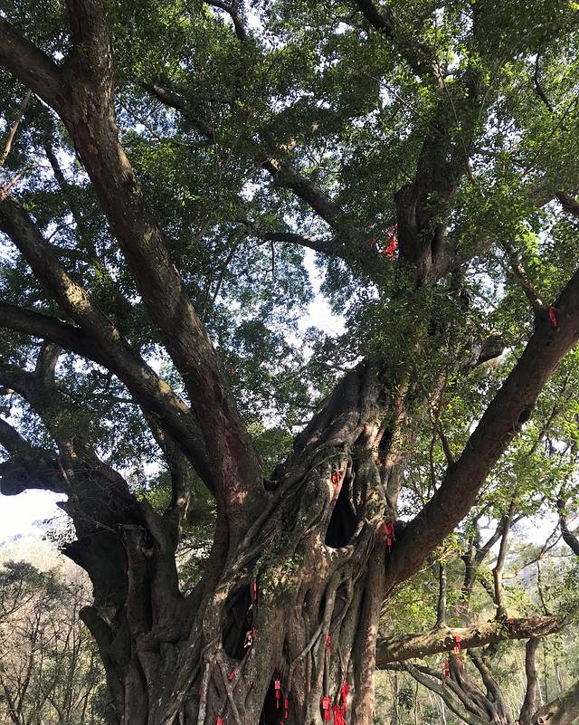 我们到达霞浦的第一站是杨家溪,包车司机小王说,如何我们到的稍早些,这里会有模特(当地村民)着民族服饰和道具供拍照。其实这个景点并不大,一进门,入眼的是几颗大榕树。这里拥有纬度最北的古榕树群和江南最大的纯枫叶林。其中最值得一提的是一株“榕树王”,它的树龄已有800多年,树干周长12.6米,冠幅直径51米,高30米,树干中空,洞内可容数人。可能是春节期间游人多,树的周围、树上总是站着一群群人,树上挂了许多红布条和祝福卡,拍起照来有点煞风景啊!