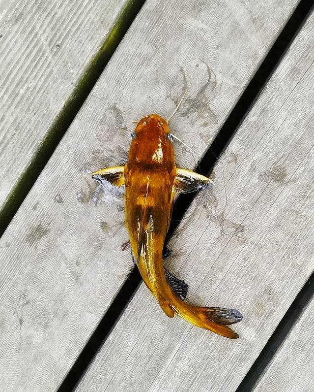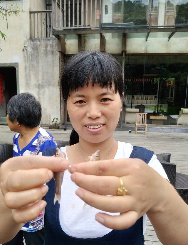 小猪也是棒棒的,一会儿一条,简直就像变魔术。这就是小猪钓上来的小鲫鱼,看芳芳多开心。我怎么觉得小鱼好可怜,看那小眼神,无助、绝望......
