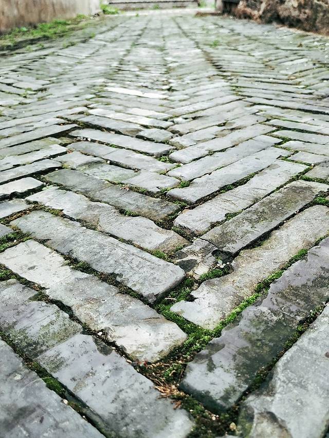 在长满苔藓的青砖上蹲着一只小 石狮 ,它在客栈的两栋房子之间的 通道 处,像是在迎接我们这些远来客,也像是在护卫这两栋老宅。