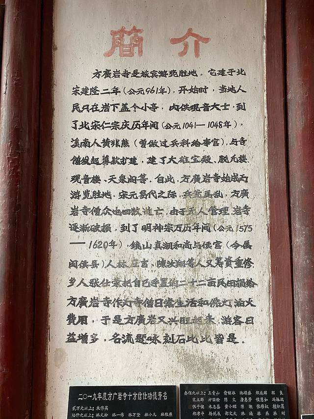 据传,方广岩原系一巨大溶洞。宋建隆二年(961年),四都溪南村黄非熊在岩下读书,发现此溶洞犹如世外桃源,遂于此建寺,从此香火不绝。因洞庭湖景物千姿百态,使人神往,取名“方广岩”。