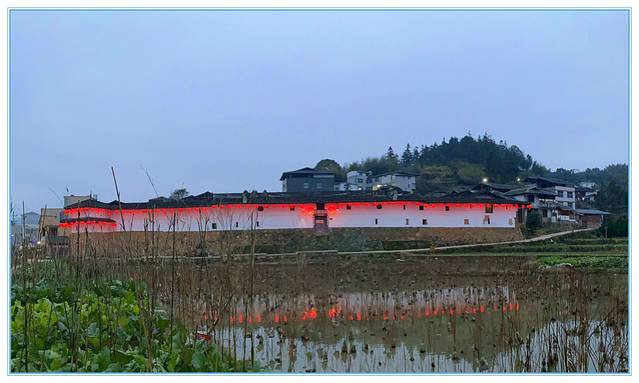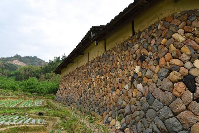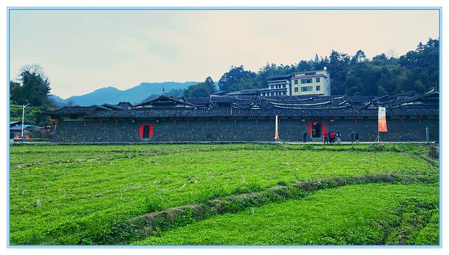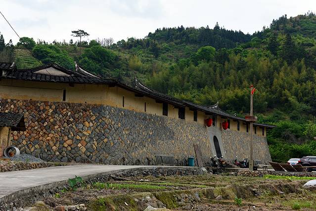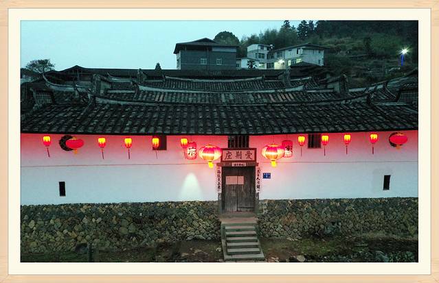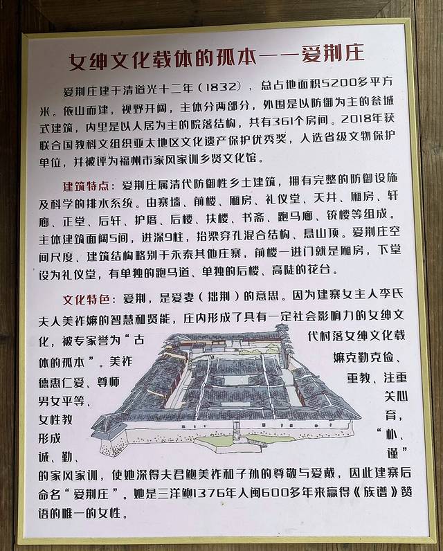 爱荆庄位于福建省福州市永泰县同安镇洋尾村,建于清道光年间,是典型的闽中土寨堡建筑。庄寨设计巧妙,构筑奇特,易守难攻。占地面积5200多平方米,共有361间房屋。庄寨两侧的跑马廊屋顶,采用悬山顶,一串屋顶如音符不断跌落,风格简洁而活泼。