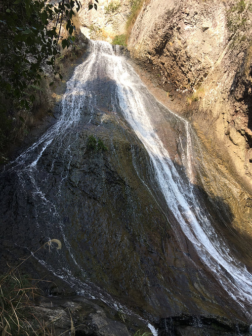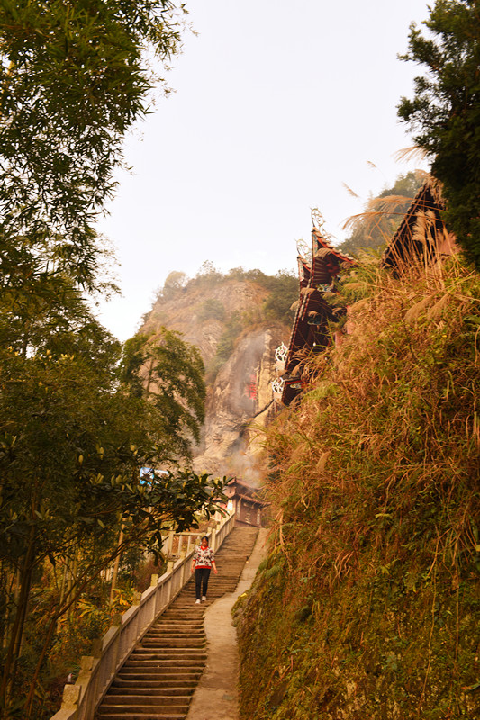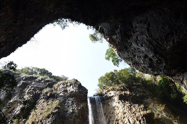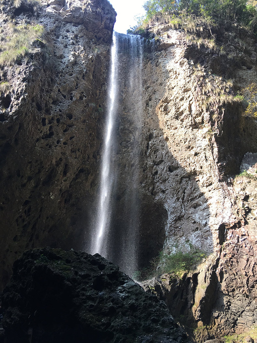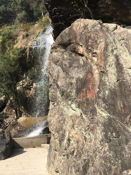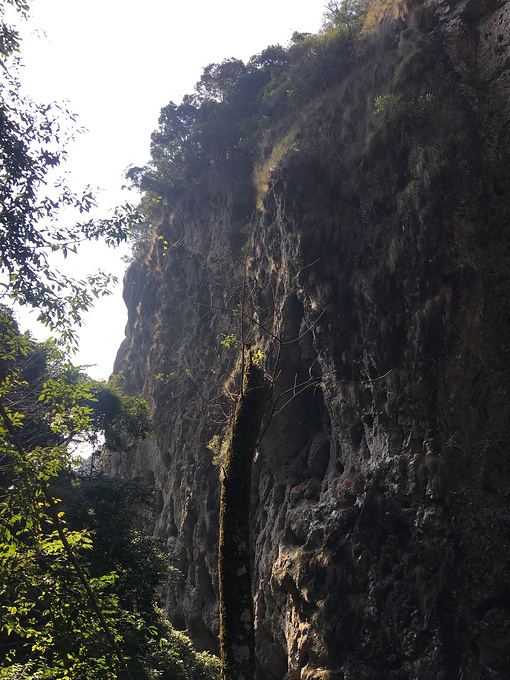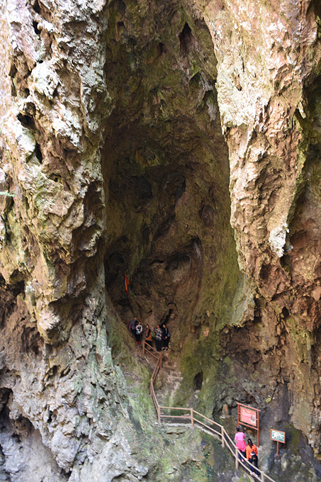 悬崖绝壁要数百洞峡最具奇观, 峡长百米,岩高百米,与对面悬崖合成峡,与侧面瀑布震出雾。气温与外相比差10度。