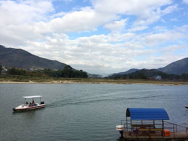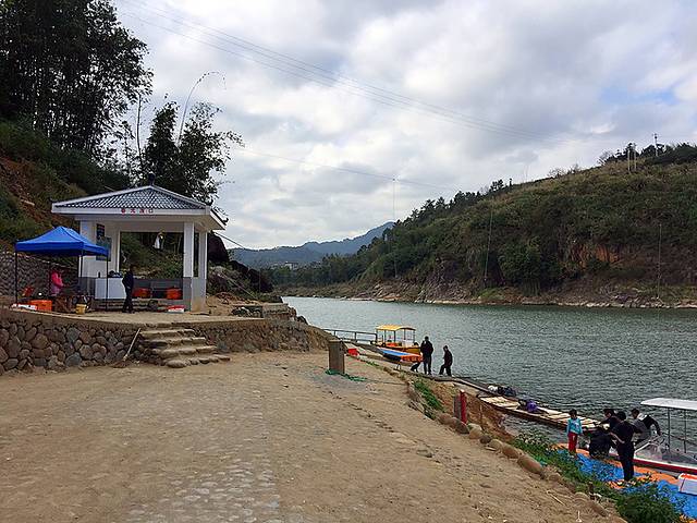 渡口畔停泊着两艘摆渡船,对面山上有座宫庙~