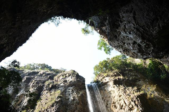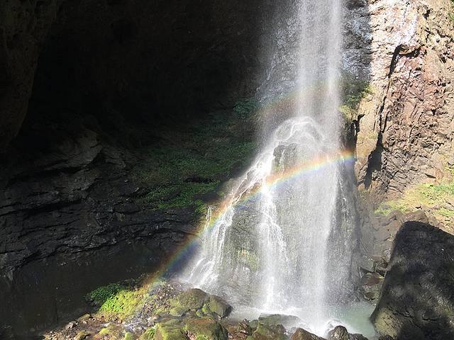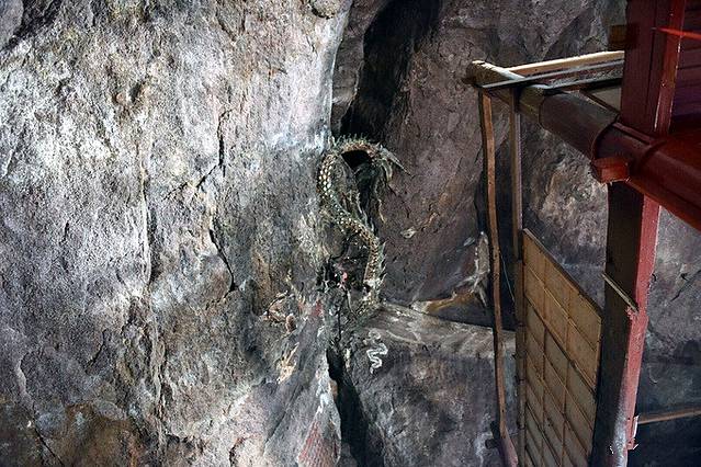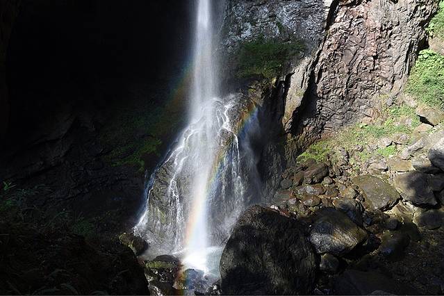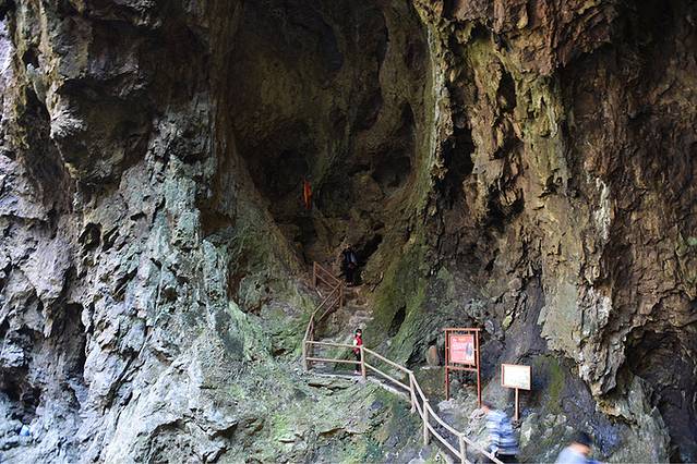 洞顶巨岩兀立,凌空舒展,称为“一片瓦”;顶上瀑布飞溅,星星点点,犹如天女散花。此二处被视为绝妙景色。