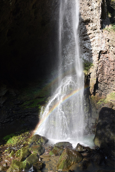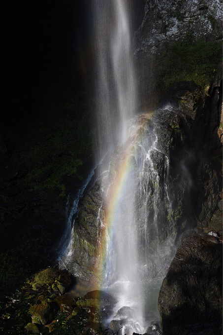 弥勒沐浴, 千仞断崖上飞瀑激流直下,如巨大的莲蓬淋在弥勒头上,直泻的瀑水,碎成千瓣万滴的水雾,在弥勒的腰间、胸前,幻化成绚丽的虹霓。