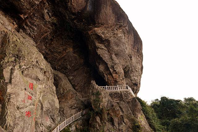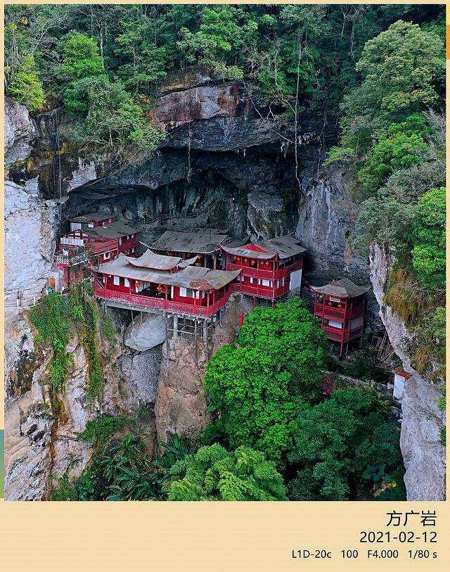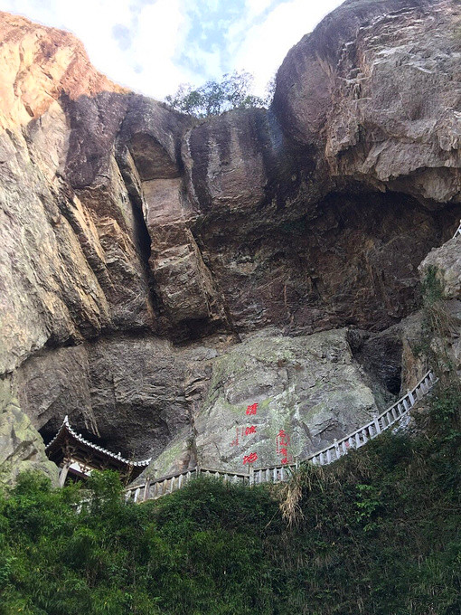 方广岩方广岩在永泰县城东葛岭山腰,距县城17公里,俗称“一片瓦”。在层峦叠嶂、林荫蔽日之中,岩体形如片瓦,凌空舒展,覆盖成一个高约20米,深约30米,宽约50米的天然洞穴,为盛夏避暑胜地,有“广寒洞天”之称。