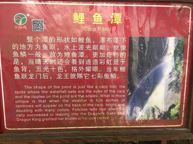 鲤鱼潭,潭形状如鲤鱼,瀑布落下的地方为鱼眼。水上波光粼粼如鱼鳞一般,故为鲤鱼潭。晴天时道道彩虹显于鱼背。当年鲤鱼跃龙门后,龙王赐予七彩鱼鳞。