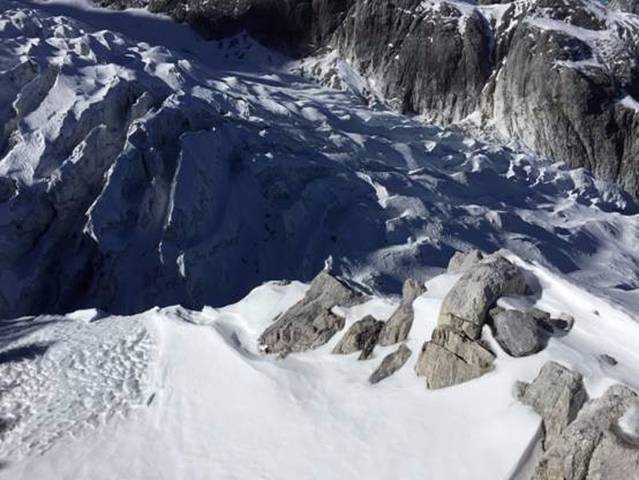 玉龙十三峰下发育有19条现代海洋性冰川,远望如一片瀑布悬挂于扇子陡下方,在阳光的照耀下,泛着银光。