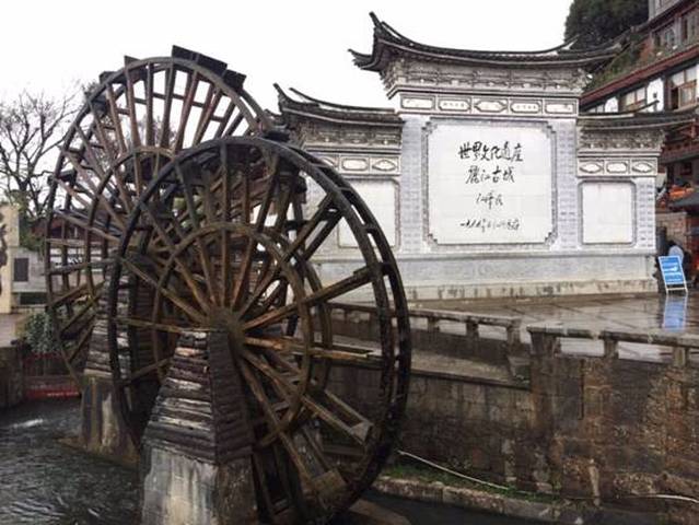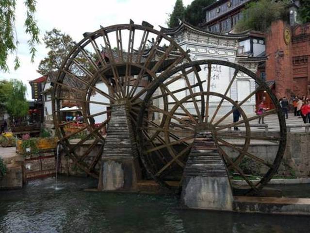 大水车在 丽江 古城大门口,是古城的一个标志性小景点。有人说是子母水车,也有人说是情人水车,很多人在那里拍照,有租少数民族的衣服,大水车的水源源不断,一直都在转。