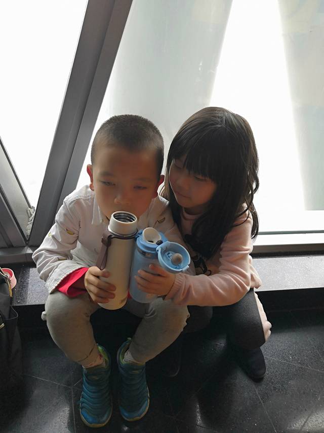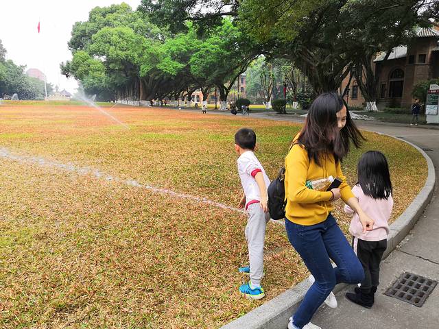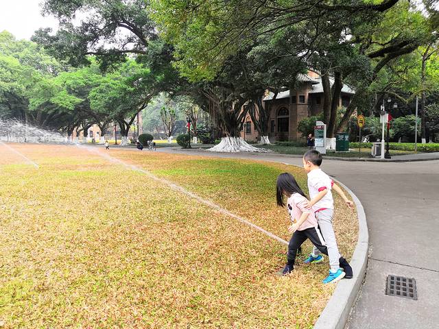 哦哟,两个小朋友发现新大陆了,这个喷头,会转方向。一转向他们,两个就激动得又叫又跳!