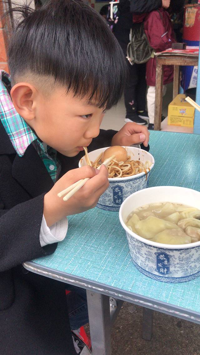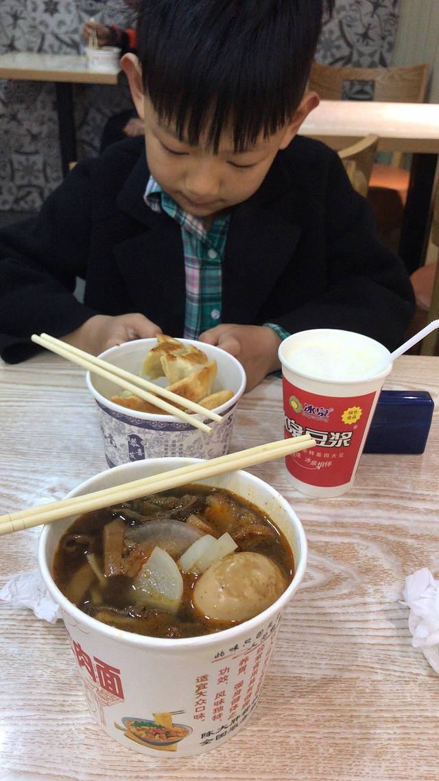 早饭,路边摊,今天早上吃牛杂面,城城吃煎饺,坚决不吃热干面了