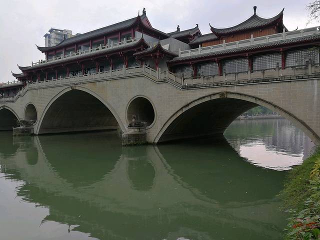 九眼桥位于成都市锦江区,古名宏济桥,又名镇江桥,始建于明万历二十一年(1593),由当时布政使余一龙所建。系石栏杆、石桥面的大拱桥,长4宽3高3丈,下有9洞。现在的桥是在原址上修建的过江钢筋混凝土桥,已经不是原来的九孔桥。