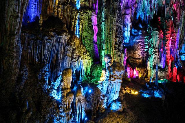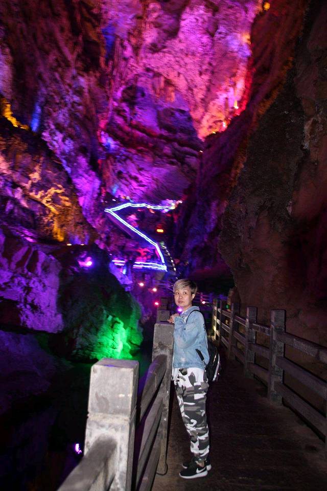 在缤纷迷离的彩色灯光映照下,太古洞内石钟乳幻化出千姿百态的造型,令人心花缭绕。
