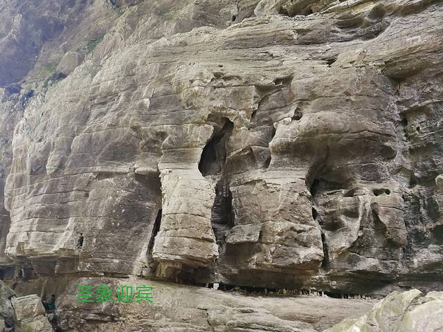 这是圣象迎宾石,位于天龙桥北石孔下方的石壁上,凸出部分酷似一头大象,它是由地下水流冲蚀和切割而形成的形象景观。