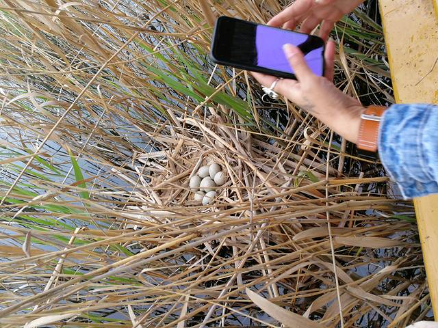 老渔夫带我们钻芦苇荡,还真的很幸运,不但抓到了鱼,而且捡到了4~5窝水鸡蛋,亲自体验了在白洋淀抓鱼捡鸟蛋的快乐,学会了芦苇荡中如何发现鸟窝,这些水鸟都把窝做在芦苇丛中,且高于水面,窝里边洼下去,像个盘子一样,又像个小船一样,在水中缓缓荡漾。