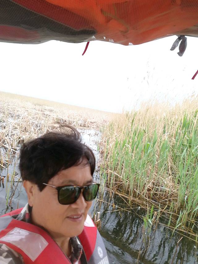 这位就是带我们游白洋淀的老渔夫,他的船在碧波荡漾的白洋淀中是燃油的机船,在钻芦苇荡捡鸟蛋时靠撑竹竿,也挺费力的。