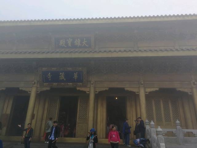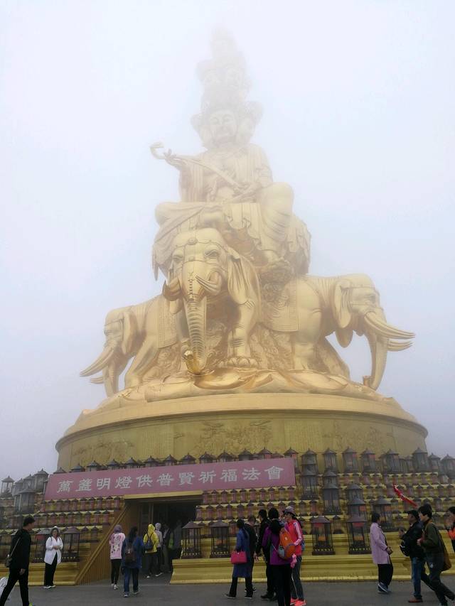浓雾中的镀金普贤菩萨像为峨眉山金顶的重要组成部分。据说原来的金顶金殿是明万历年间妙峰禅师创建的铜殿,万历皇帝朱翊钧题名“永明华藏寺”。金顶的得名,即来源于“金殿”。1972年的一场大火使华藏寺变为了灰烬,现在的金顶是1986年,国家拨款260万元,重建的华藏寺,1990年9月11日落成。现今华藏寺比原先华藏寺规模大,飞阁流丹,崇宏壮丽,殿字轩昂,高耸入云。如果是晴天,普贤菩萨像一定是金光闪闪。