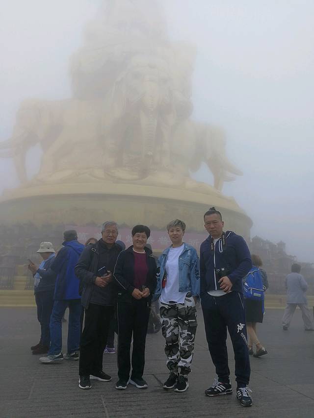 普贤菩萨像前留影,此时是下午两点的,雾滴已变成了蒙蒙细雨。