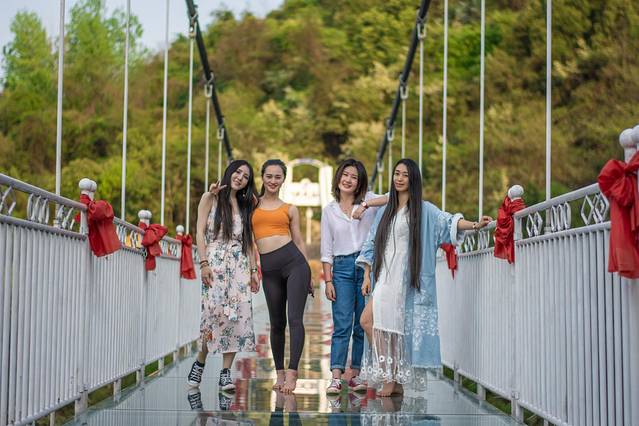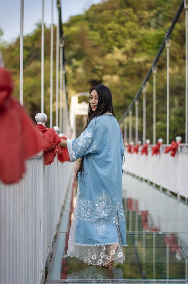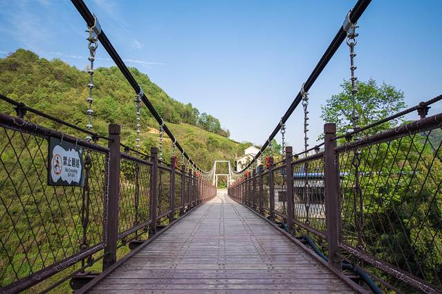 景区内除了这条索桥,还有一条相对更长的桥,不过相对于前者他不会有太大的摇晃,比较平稳。但景区内最网红的,应该就是位于两山之间的玻璃桥了。三峡九凤谷云山天桥通体都是玻璃铺就而成的,它长约130米,是十多块3米宽的玻璃拼驾而成。这座17年9月才竣工的三峡地区规模最大的玻璃桥可以说是远近闻名的网红,站在桥上向下望,是百米的峡谷深渊,在上面听听风从耳边呼啸而过的声音,多少是会有点惊魂刺激的感觉。