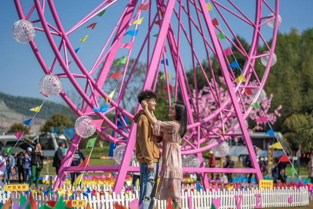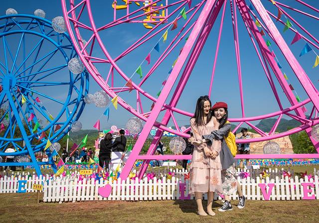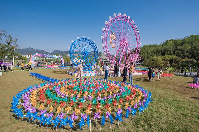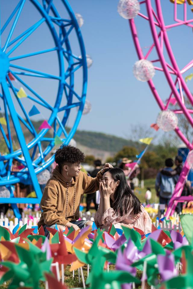 没有无人机上不来了天,看不到壮丽的山河大景,我就只能躲在风车后拍拍小姐姐和小哥哥了。不过不得不说,在阵阵的春风中听着清脆的风铃声确实有一种无以言表的浪漫情怀。风铃节扽当天,在景区内除了有悬挂二而起的各色风铃,还有油纸伞道、荷兰风车和蓝粉两色的摩天轮。