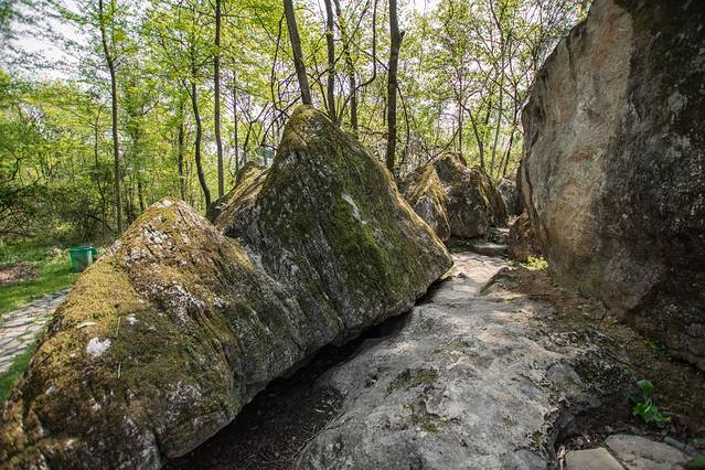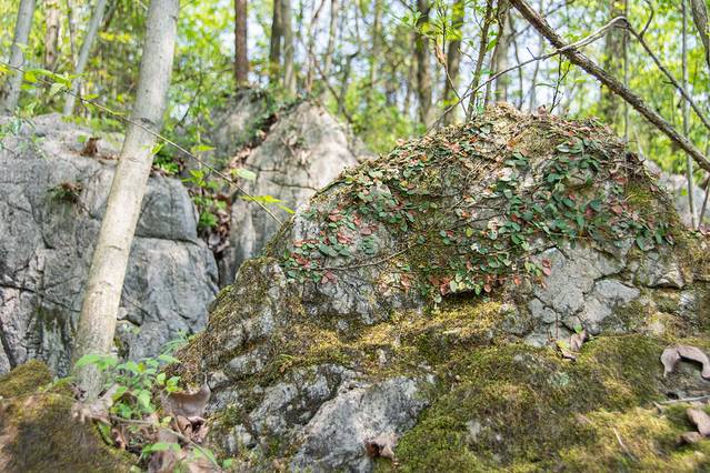 如果是时间的跨度给人的惊叹,那么幽幽的小径、零落的奇石则是一处揽胜的绝佳场所。从进去大门而入,先是看到了一片种植在奥陶纪石林中的茶田。而后,一路走过许多形象逼真的石像,印象深刻的诸如神龟迎宾、鲸鱼冲天等等。而景区内的四十八门则是一处必须走进去转转的小景点。