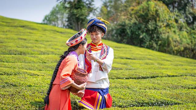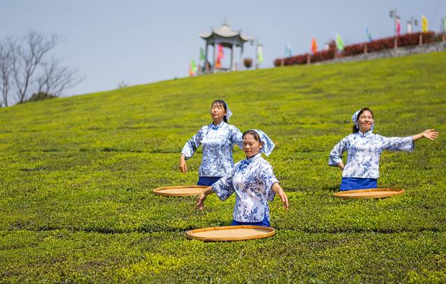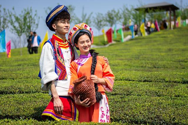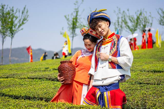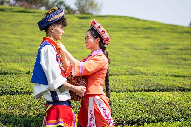 可能正是因为女儿会活动的原因,我们在吕家坳成片的茶园内看到了身着土家族传统服饰的年轻人。不仅如此,还有前来拍摄采茶歌舞的媒体和茶娘等等。
