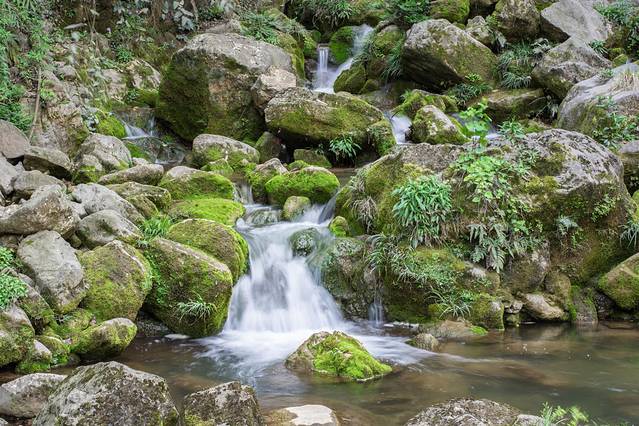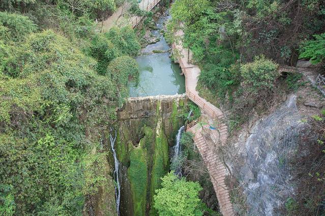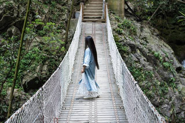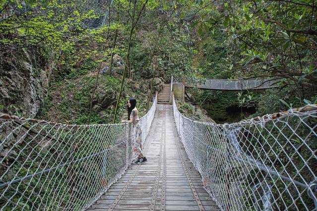 走过紫荆和紫藤的花海世界,变要开始在峡谷中逐级攀登前往顶部的玻璃栈桥了。远远的,我们便听见了水流不断冲打着石头的声音,虽说不是雨季,但九凤谷内的瀑布还是有一定的规模的。踏着石阶,沿着水流不断往上,两侧的树林也越来越密,听着回震在山谷之中的水流声,先是要经过一座横驾于密林之间的索桥。虽说不算太长,但摇晃的感觉还是会令人些许有些畏惧。
