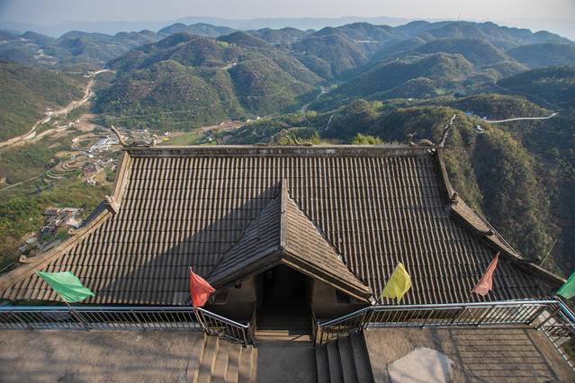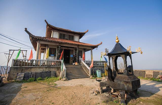 沿着台阶逐级而上,先是临山而建的观音阁,一鼓作气登临山顶,便是金顶道观了。据记载,梁山的道教活动起于梁武帝时期,距今已经有1500多年的历史了,而山麓之上的观音阁也是在唐代时期就已经声明在外。