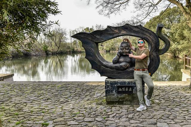 为了纪念丝绸给西溪人家带来的财富,所以在西溪人家的中间位置设了一个这样的雕塑,这个雕塑是蚕宝宝的人像化的了,非常可爱的雕塑。