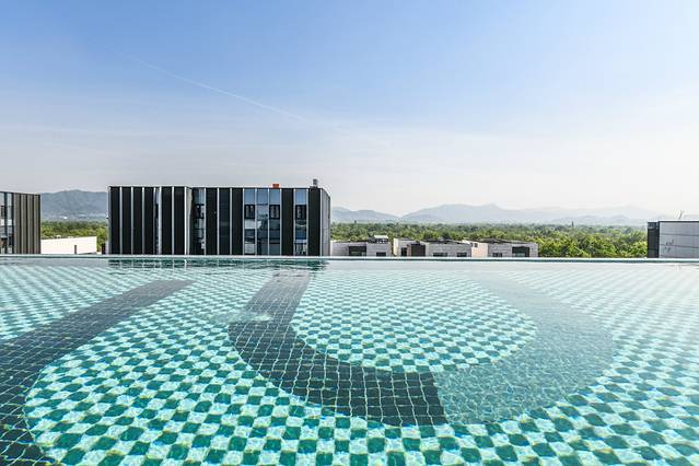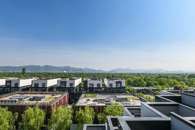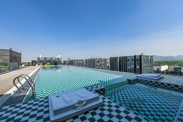 庐境西溪酒店的公共区域除了门口的小型停车空间之外,还有酒店外的休息处,楼顶的无边际泳池和池畔烧烤区域这些,在杭州地区是非常有特色的酒店。