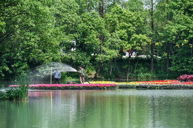 繁忙的园丁们为花朝节不断的喷洒水,让花朝节的花儿们更美更有朝气。