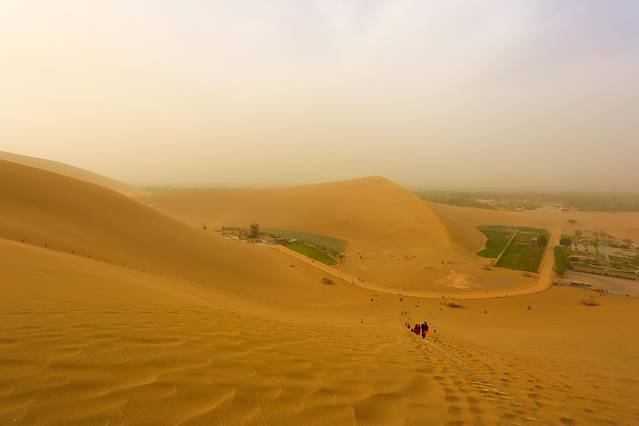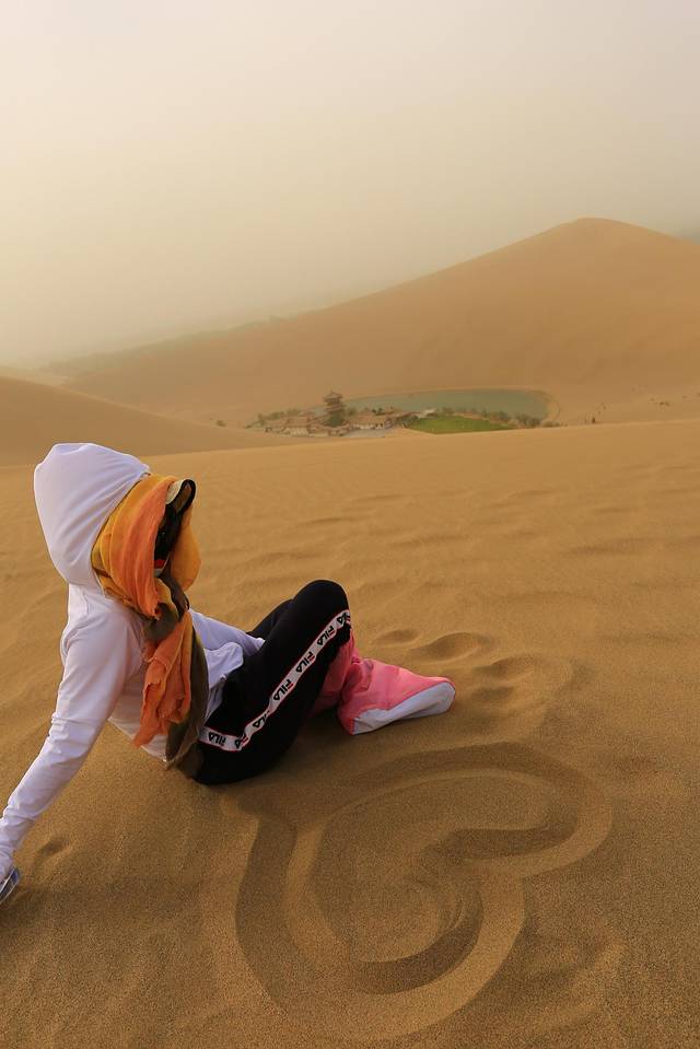 骆驼会把我们放在鸣沙山附近,想要一睹月牙泉的芳容,必须徒步登上沙山。对于沙尘天气中的我们,呼吸已经十分困难,为了不留遗憾,玲姐执意要登上山顶,不得不让人佩服。最终登上山顶,风景没有辜负我们,鸣沙山月牙泉的千年厮守,造就了这大漠清泉的奇特景象,是古丝绸之路上的一块瑰宝。
