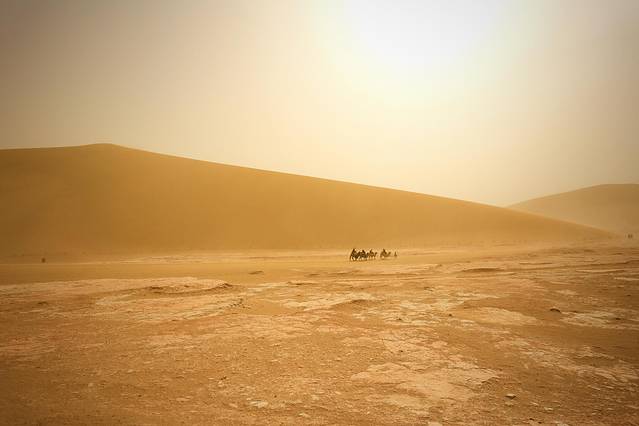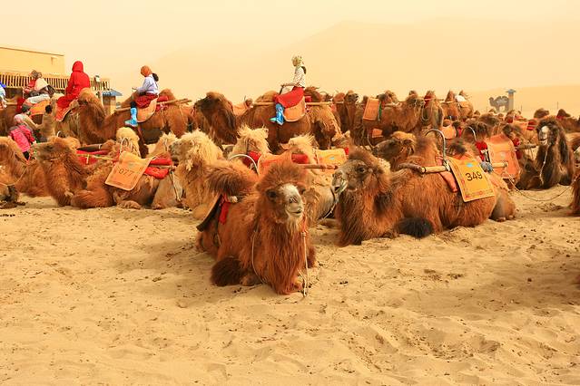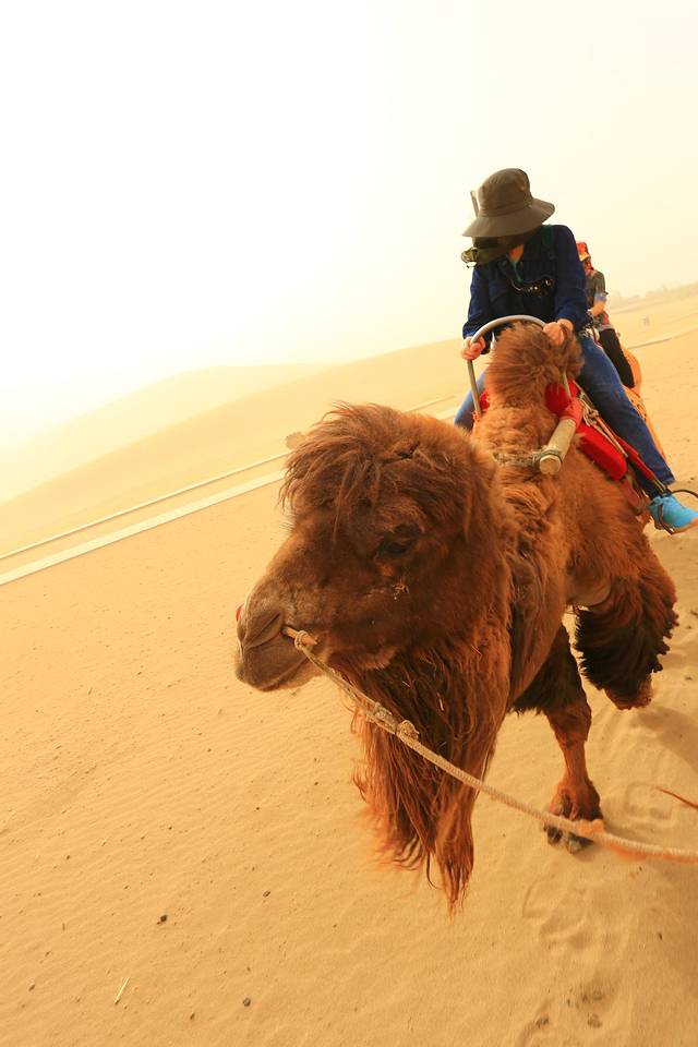 鸣沙山的沙子非常细,加之当天的沙尘天气,穿着短裤骑骆驼的我,腿被沙子打得生疼,眼睛也几乎无法睁开。连骆驼都要躲在同伴后面避风,我们渺小的人类就更加难以招架了~