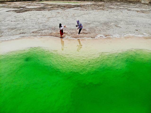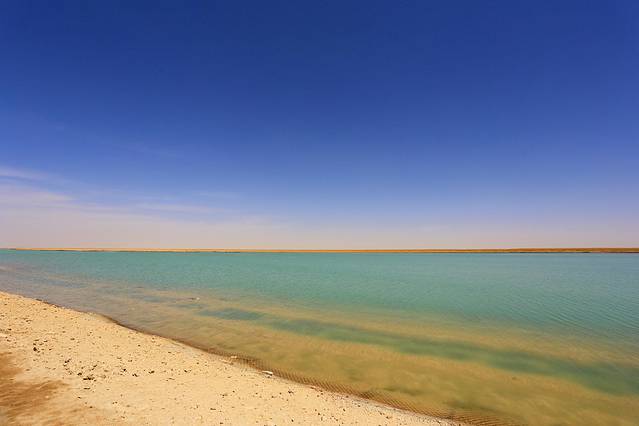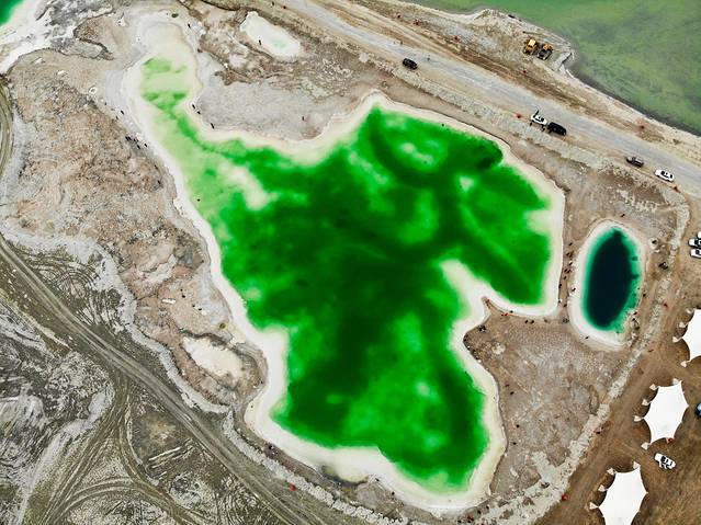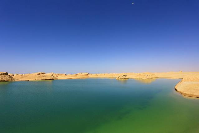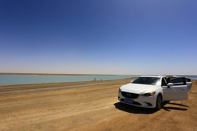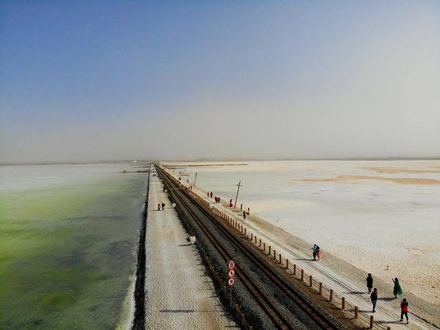 西台吉乃尔湖,位于水上雅丹的北面,湖水一边呈蓝色,一边呈绿色。315国道穿湖而过,路上车少景美。车上有天窗的,可以尽情发挥你们的创意,千万不要错过这航拍的绝佳机会。
